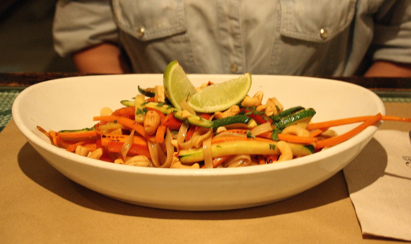 Oben: veganes Pad Thai: Bestehend aus fein geschnittenem, kurz angebratenem Gemüse (Zucchini, Paprika, Möhren), Tofu, Reisbandnudeln in einer Sojasauce, Limette und Erdnüssen. Alles sehr gut aufeinander abgestimmt und extrem lecker!