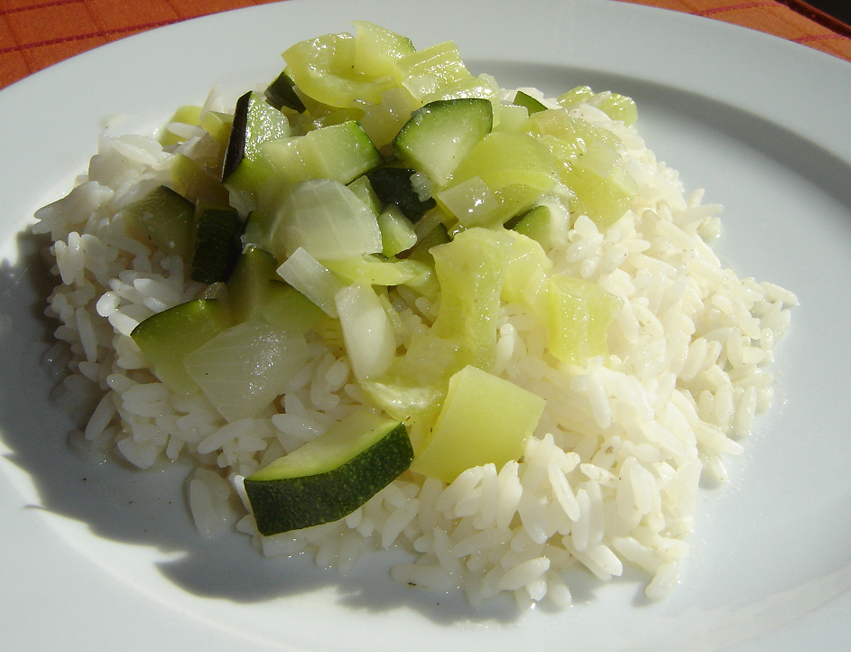 Ein ähnliches Rezept hatten wir vor ein paar Wochen hier schon einmal. Damals ohne die Spitzpaprika dafür aber mit Nudeln. Jetzt etwas ganz ähnliches, aber mit Reis und eben grünen Spitzpaprika: